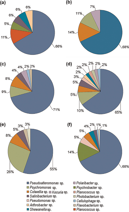The taxonomic identification of the representative isolates from each of the 63 phylotypes indicated that 49 of them were represented by gram-negative bacteria and 14 by gram-positive bacteria. Out of the 14 gram-positive phylotypes, 12 belonged to the phylum Actinobacteria, represented by the genera Arthrobacter, Salinibacterium, Kocuria and Williamsia, and two belonged to the phylum Firmicutes (class Bacilli), which was represented by the genus Planococcus. Conversely, out of the 49 gram-negative phylotypes, 45 belonged to the phylum Proteobacteria and four to the phylum Bacteroidetes. The phylum Bacteroidetes was represented for the class Flavobacteria, with isolates belonging to the genera Polaribacter, Cellulophaga and Flavobacterium. The phylum Proteobacteria was represented by 43 phylotypes belonging to the class Gammaproteobacteria, one to the class Alphaproteobacteria and one to the class Betaproteobacteria. Among the Gammaproteobacteria, a total of 12 different genera were identified (Table 2). Of these, Pseudoalteromonas and Psychrobacter were the most frequently recovered, representing the largest groups in terms of the number of isolates (65 isolates belonged to the genus Psychrobacter and 58 belonged to the genus Pseudoalteromonas). These two genera proved to be ubiquitous in Potter Cove, being recovered from almost all the samples screened: sediments, seawater, crustaceans, bivalves, ascidians, isopods, salps, amphipods, polychaetes, starfish, different fish species and algae.