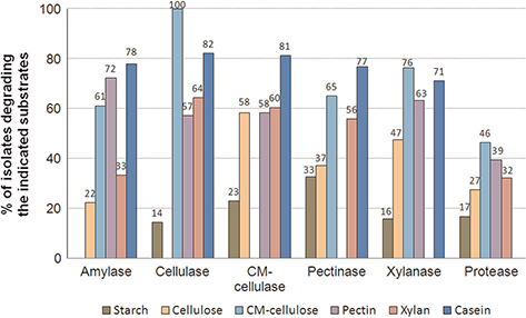 It is important to remark that many isolates produced more than one extracellular enzyme: two were positive for the six enzymatic activities screened, 16 were positive for five of them, 12 produced three to four of the hydrolytic enzymes tested and 16 were positive for two of them. A total of 51 isolates produced only one enzyme activity. Consequently, we considered the hypothesis that the success in the isolation of bacteria producing multiple hydrolytic enzymes can be optimized by applying selective pressure for a single enzyme activity at the initial isolation step, and then to test the other activities of interest. To assess this, the results from our screening were used to calculate, for the total isolates producing each enzymatic activity tested, the percentage that also produced the other enzymes screened (Fig. 2). In this way, for example, all the isolates that in our screening were positive for amylase were considered as the 100% of a hypothetic screening using starch as sole carbon source; and then the percentages of isolates capable of utilizing each one of the other substrates (cellulose, pectin, casein, etc.) were calculated. The analysis showed that protease was the most frequently found activity within the groups that had been obtained if initial isolation had been made on media selective for amylase, CM-cellulase and pectinase hydrolytic activities. In the groups simulating direct selection for cellulase and xylanase producers, CM-cellulase was the most frequent activity and protease activity was the second one. The uptake and hydrolysis of crystalline cellulose is more difficult for bacteria than that of its soluble derivative CM-cellulase (Ulrich et al. 2007), so it is not surprising that isolates producing cellulases were all able to hydrolyse CM-cellulase. Therefore, the production of proteases represented the main secondary activity produced by the isolates recovered from four out of the five simulated selective isolation conditions.