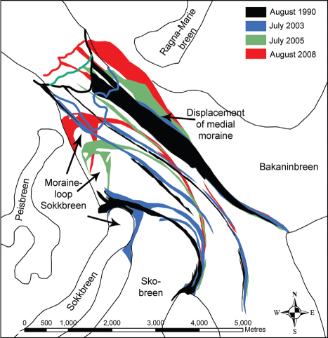 Development of the surge illustrated by the progressive displacement of medial moraines and end moraine loops as well as the glacier-front positions. The illustration is based on the following images: NP1990 1:50.000 (black), Advanced Spaceborne Thermal Emission (ASTER) 24 July 2003 (blue), ASTER 23 July 2005 (green) and ASTER 4 August 2008 (red).