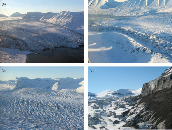 Skobreen–Paulabreen during and following the surge. (a) The lower part of Paulabreen, viewed towards the south on 26 September 2005. Skobreen occupies the cirque in the upper middle part of the photograph, and the boundary between surging and non-surging ice on Paulabreen is visible on the upper left. (b) The surge front at the south-west margin of Paulabreen, 26 September 2005. Note the chaotically crevassed ice near the glacier front, behind which the ice is relatively uncrevassed. In the foreground of the photograph is a crevassed forebulge formed of old, buried glacier ice. (c) View over Paulabreen into Skobreen, 26 September 2005. (d) Remnant ice stranded above Skobreen after surge termination, 18 June 2007. The ice cliff is ca. 50 m high.