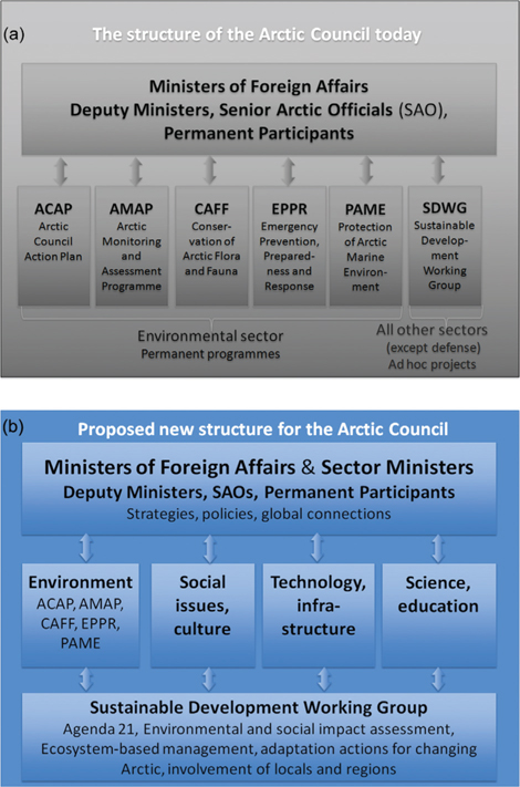 (a) The structure of the Arctic Council as it is today and (b) a proposed new structure for the council.