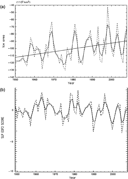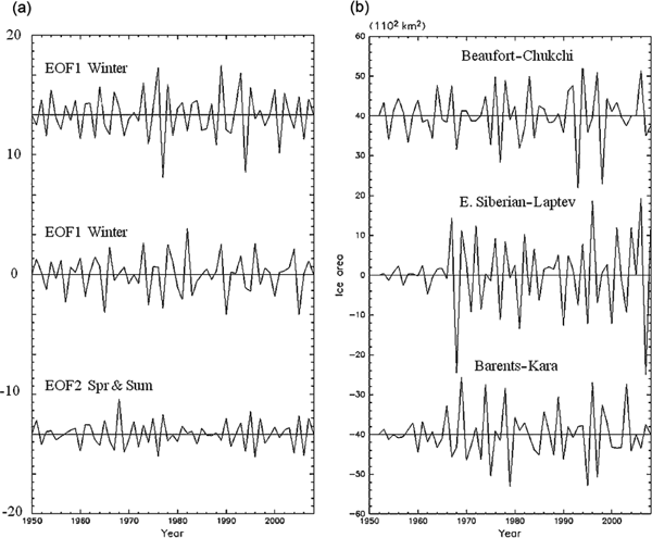 The low-pass filtered NAM/AO shows very clear decadal oscillations from 1965 to 1995 but minor variations after this period (Fig. 2), as previously reported by many authors. The sea-ice areas were taken from ice concentration data in the same way as in previous studies (e.g., Ikeda et al. 2003; Wang et al. 2009). The low-pass filtered ice areas also display decadal oscillations during 1965–1995, superimposed upon the declining trends (Fig. 1). The effects of the first EOF have been examined extensively (e.g., Wang & Ikeda 2000; Rigor et al. 2002) but were revisited in this study. The ice cover was reported to reduce sequentially in the Beaufort–Chukchi seas, the East Siberian–Laptev seas and the Barents–Kara seas in response to the positive phases of the NAM/AO (Mysak & Venegas 1998). In the study reported in this paper, this sequence was examined statistically.