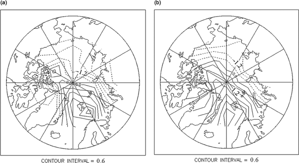(a) The sea-level pressure composite of the positive winter Arctic Dipole Mode in 1978, 1979, 1982 and 1996 and (b) the negative winter Arctic Dipole Mode in 1990, 2000 and 2005.