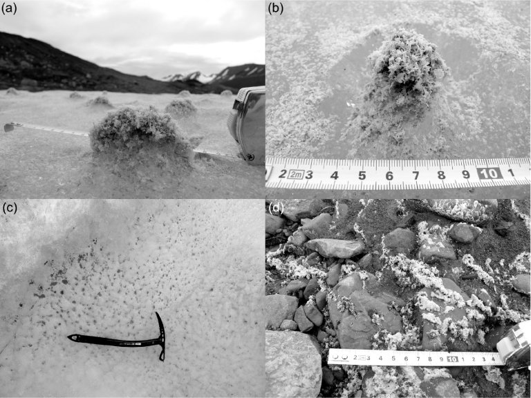 (a) Picture of raised calcite precipitate cones on the naled surface; (b) oblique picture of a calcite precipitate cone showing the surrounding sun-cup and the widespread distribution of calcite precipitates on the naled surface; (c) calcite precipitate accumulation in cryoconite holes in the naled surface and (d) calcite precipitates on top of outwash sediments on a river bar after the naled has melted.