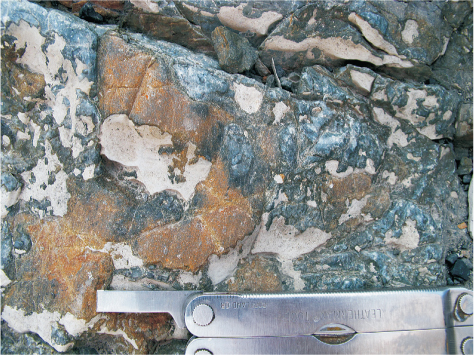 Calcite precipitates on striated hard rock in front of Aldegondabreen, 6 km north of Austre Grønfjordbreen. The precipitation occurred in subglacial cavities as a consequence of subglacial regelation and calcite saturation.