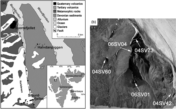 In north-western Spitsbergen, near the fjords Bockfjorden and Woodfjorden, there are several Quaternary-age volcanic extrusive constructs and subvolcanic pipes of alkaline olivine basalt (Fig. 1). Sverrefjellet is the most accessible and widely known of these volcanoes, in part because of its abundant mantle xenoliths (Amundsen et al. 1987; Ionov et al. 1996; Kopylova et al. 1996). The ages of Sverrefjellet and the other volcanoes are tectonically important, as they represent off-axis eruptions associated with the Knipovich mid-ocean ridge (Crane et al. 2001; Sushchevskaya et al. 2008). These volcanoes and several active hot springs sit along, or near, the Breibogen–Bockfjorden fault system (Evdokimov 2000; Jamtveit et al. 2006; Salvigsen & Høgvard 2007), which runs along Bockfjorden, and extends south to Isfjorden (near Longyearbyen) and north offshore onto the Yermak Plateau (Fig. 1a; Crane et al. 2001). Current motion on the Breibogen fault system is extensional, both from local observations and a regional perspective (Crane et al. 2001).