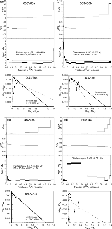 The Ar–Ar ages of the Sverrefjellet samples with recognizable plateaus or isochrons are all in the vicinity of a million years, roughly consistent with earlier K–Ar ages but not consistent with inferences from stratigraphy or geomorphology. The most likely age of the eruption is 1.05±0.07 (1σ) My (mean square weighted deviation = 1.9), which is the uncertainty-weighted mean of the following ages (Table 2): inverse isochron ages for 04SV42a, 04SV60b and 04SV73b (samples with 40Ar/39Ar(i) different from air); and plateau ages of 04SV42b, 04SV60a, 04SV73a and 06SV01Ca (samples with 40Ar/39Ar(i) closer to that of air). Ar–Ar plateau ages range from 0.6 to 1.4 My, and isochron ages range from 0.9 to 1.6 My (Table 2). This range of results reflects, in part, uncertainty because of the small proportions of radiogenic argon in the Sverrefjellet samples—no thermal release step contains more than 50% radiogenic 40Ar, and most contain <15%.