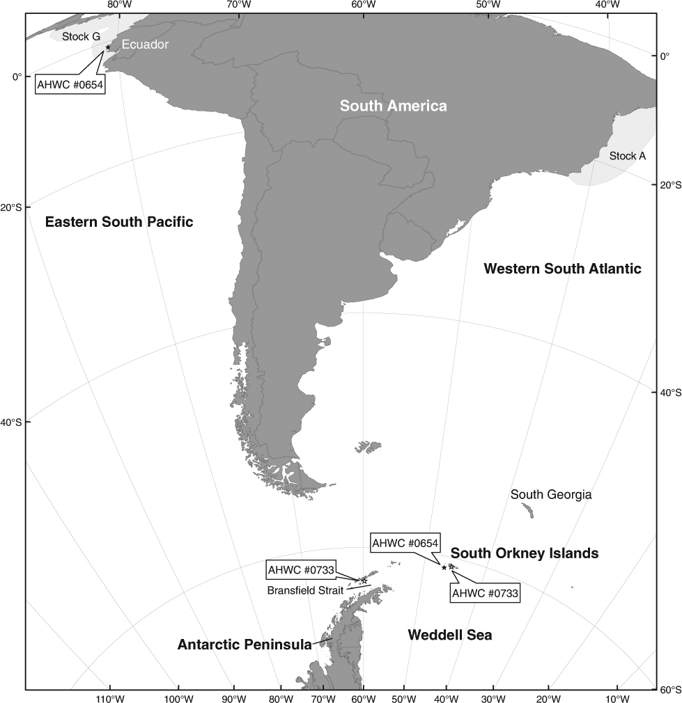 Locations of humpback whale photo-identification matches between the South Orkney Islands and Ecuador (north-western coast of South America) and Bransfield Strait (western Antarctic Peninsula). Breeding areas for the eastern South Pacific (Stock G) and western South Atlantic (Stock A) populations are represented in light grey.