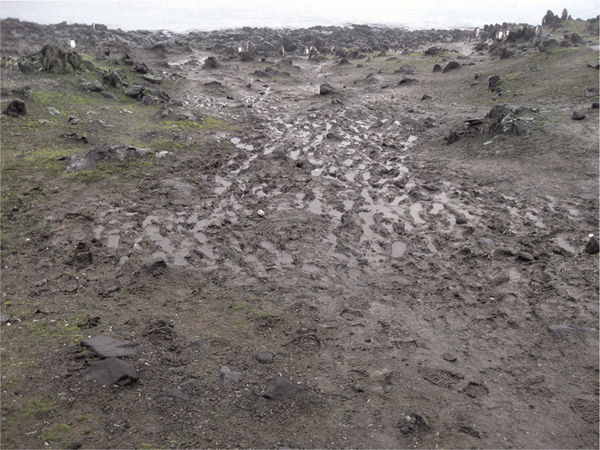 Waterlogged area on the designated track route on Barrientos Island. Pedestrians trying to avoid the mud widen the track.