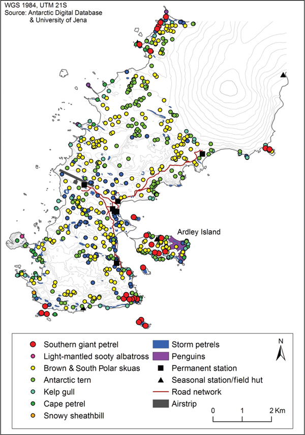 The Fildes Region is a breeding area for 13 seabird species and reproduction site for four seal species (Figs. 2, 3, Table 2). Skuas (Catharacta antarctica lonnbergi, C. maccormicki), Antarctic terns (Sterna vittata) and storm petrels (Oceanites oceanicus, Fregetta tropica) also breed in the vicinity of the stations and the airstrip. The highest breeding pair density was found on Ardley Island (ASPA No. 150).