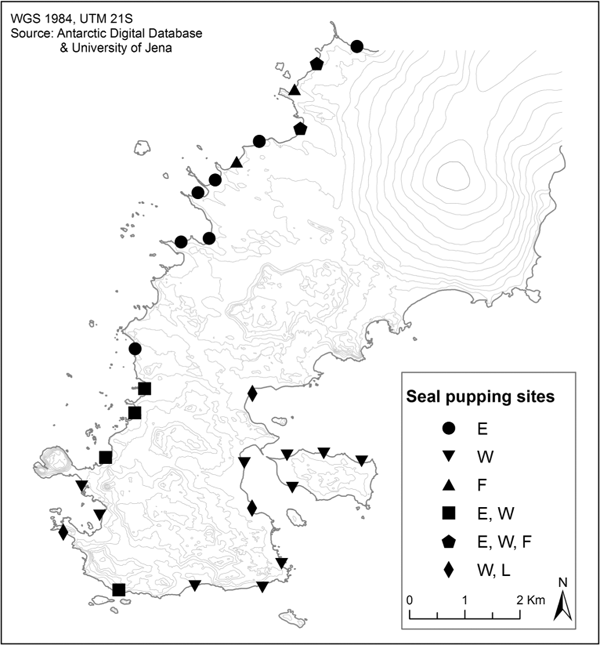 The location of pupping sites for elephant seals (Mirounga leonina; E), Weddell seals (Leptonychotes weddelli; W), fur seals (Arctocephalus gazella; F) and leopard seals (Hydrurga leptonyx; L). Data from 2003/04 to 2009/10 are included.