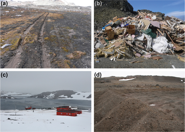 Examples of environmental impacts in the Fildes Region: (a) vegetation damage caused by land traffic; (b) open waste deposit; (c) diesel plume in Maxwell Bay (visible as the sheen on the ocean in the centre of the image); and (d) beach ridge, damaged by quarrying.