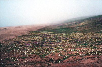 The total extent of Tripleurospermum maritimum ssp. phaeocephalum extending into the distance above the strandline west of Granatdal, looking west, on 27 July 2003. Note the presence of sea fog.