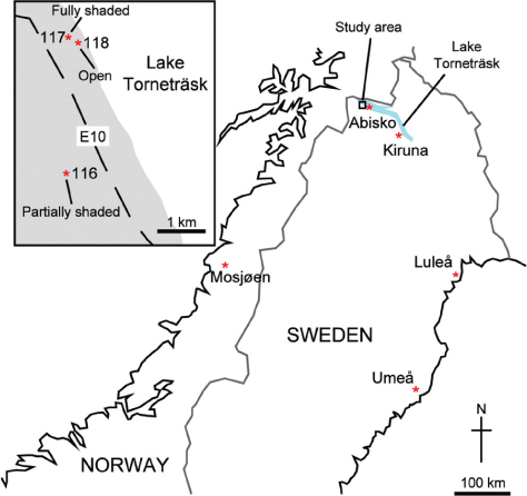 Location map of collection sites in northern Sweden. Area is located approximately 200 km north of the Arctic Circle, with collection sites adjacent to the shore of Lake Torneträsk. Marker 118 marks the location of the open-sky site (68° 25.902 N, 18° 40.278 E, 341 m a.s.l.); marker 117 is the fully shaded forest site (68° 25.833 N, 18° 40.370 E, 351 m a.s.l.); marker 116 is the partially shaded forest margin site (68° 24.578 N, 18° 40.805 E, 474 m a.s.l.).