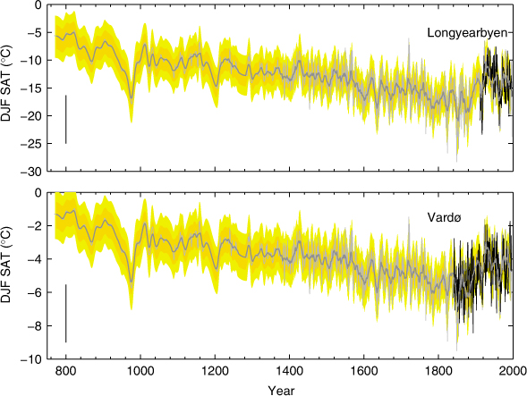 A long-term cooling revealed in winter temperatures in Svalbard and northern Norway is in line with a multicentennial decline in winter North Atlantic Oscillation that occurred during approximately the same period of time and marked the transition from the Medieval Climate Anomaly to the Little Ice Age in Europe (Trouet et al. 2009). It is known that on annual to sub-decadal timescales the effects of North Atlantic Oscillation–related variability on Svalbard climate are not well pronounced (e.g., Marshall et al. 2001; Zhang et al. 2004). On the longer timescales, however, such a shift to a persistently negative North Atlantic Oscillation would imply a decreasing atmospheric and oceanic heat flux to the north-east and, hence, a gradual cooling and sea-ice expansion in the Nordic seas (e.g., Marshall et al. 2001).