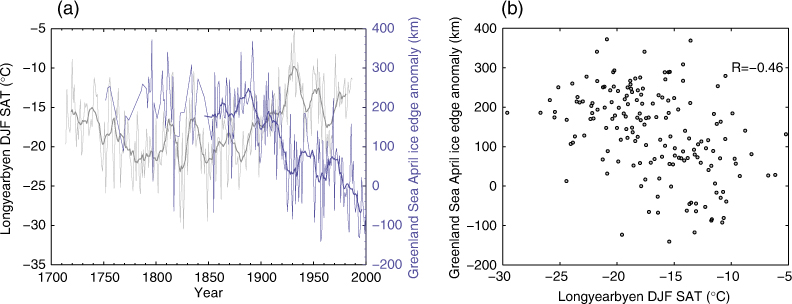(a) Longyearbyen reconstructed December–February (DJF) surface air temperatures (SAT) from the stacked δ18O Lomonosovfonna and Holtedahlfonna ice core series (grey) and Greenland Sea April ice extent ice edge anomaly (blue), also shown as (b) a scatter plot. Thick solid lines show the 11-year running means. Due to the sea-ice data sparsity prior to the mid-1800s, the running mean is estimated only for the period of 1850–onwards.