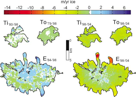 During the first period from 1979–1984 to 1998, ice flow compensated for the ablation in the lowest parts of Tindfjallajökull and also more or less in the lower ablation areas of Eyjafjallajökull and Torfajökull (Figs. 3, 4); there was mass gain in the lowest three narrow outlet glaciers of Eyjafjallajökull and mass loss in the lowest parts of Torfajökull. In contrast, all the ice caps retreated rapidly during the warmer period from 1998 to 2004 (periods 1 and 2 in Table 3), when 3–5 m yr−1 w. eq. thinning rate was obtained on the lowest parts of Torfajökull and Tindfjallajökull (reaching down to 700–800 m a.s.l.) and up to 14 m yr−1 w. eq. thinning rate on the lowest part of the Gígjökull outlet of Eyjafjallajökull, down to 200 m a.s.l. in 2004 (Fig. 4).