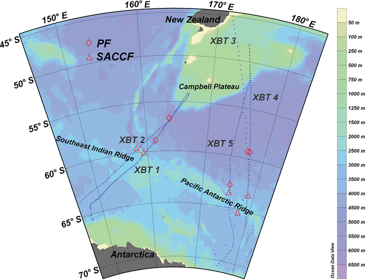 Geographic locations of five expendable bathythermograph (XBT) sections between New Zealand and Antarctica made by the research vessels N.B. Palmer and Italica from mid-October 2004 into early January 2005. The positions of main fronts—the Polar Front (PF) and the southern Antarctic Circumpolar Current front (SACCF)—are plotted.