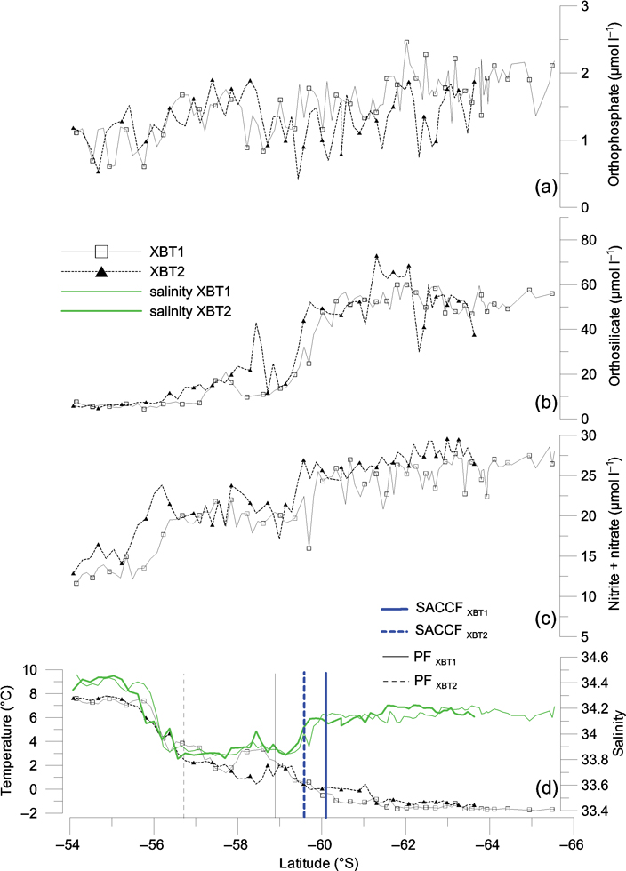 The ACC is the major current in the Southern Ocean, isolating the warm stratified subtropical waters from the more homogeneous cold polar waters. Nutrient and XBT observations can be helpful in understanding possible links between thermal and chemical changes of its near-surface fronts and zones. A strong latitudinal gradient in orthosilicate concentration is centred near the PF but also extends well south of that feature as a result of the upwelling of the CDW. Orthophosphate and NO2+NO3 concentrations reveal the position of the SAF better than other nutrients during spring and better in spring than summer when phytoplankton growth causes the depletion of these macronutrients. This feature could be due to uptake by different phytoplankton groups not dominated by diatoms or silicoflagellates as well as to the absence of strong orthosilicate input at the surface, as happens south of PF.