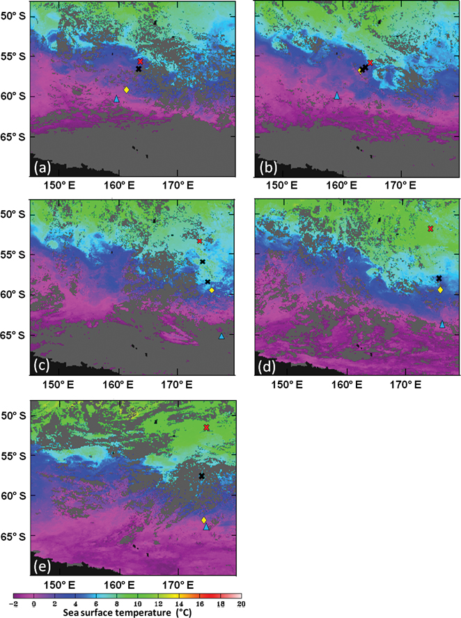 Eight-day composites of sea surface temperature (°C) from Moderate Resolution Imaging Spectroradiometer (MODIS) images for the study site during the five expendable bathythermograph (XBT) transects: (a) XBT 1, 15–22 October 2004; (b) XBT 2. 31 October–8 November 2004; (c) XBT 3, 8–15 November 2004; (d) XBT 4, 2–9 December 2004 and (e) XBT 5, 1–8 January 2005 (images from http://poet.jpl.nasa.gov/. Grey areas represent missing data, primarily due to cloud cover. The positions of the northern Subantarctic Front (red cross), the southern Subantarctic Front (black cross), the Polar Front (yellow diamond) and the southern Antarctic Circumpolar Current front (blue triangle) are indicated.