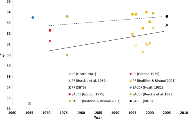 Latitude of the Polar Front (PF) and the front of the southern Antarctic Circumpolar Current (SACCF) as observed by Gordon (1975), Heath (1981), Burckle et al. (1987), Budillon & Rintoul (2003) and in our fifth transect. The PF is identified by temperatures below 2°C at 200 m and the SACCF by temperatures below 0°C at depths lower than 150 m and above 1.8°C at depths >500 m (Orsi et al. 1995). The solid line shows the PF regression over the past 40 yrs and the dotted line shows the regression of the SACCF over the same time span; the PF by Heath (1981) was not used for the regression.
