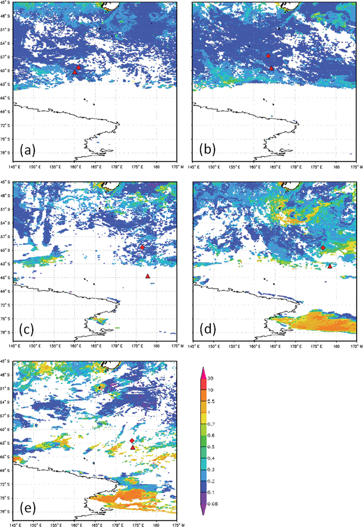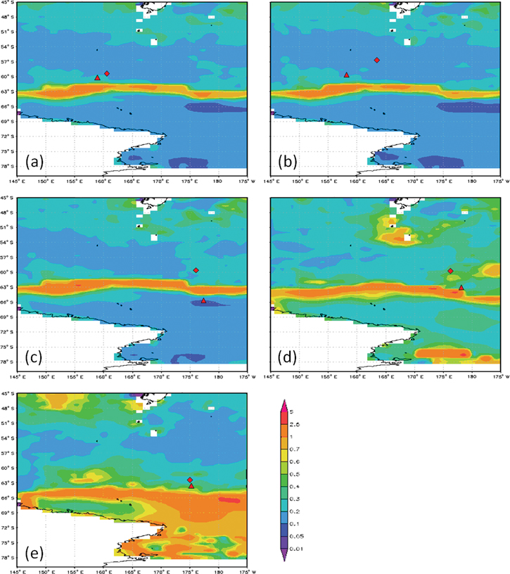 Eight-day composites of the National Aeronautics and Space Administration's Ocean Biogeochemical Model (NOBM) imagery of diatoms (mg m−3) for the study site during the five expendable bathythermograph (XBT) transects: (a) XBT 1, 15–22 October 2004; (b) XBT 2, 31 October–7 November 2004; (c) XBT 3, 8–15 November 2004; (d) XBT 4, 2–9 December and (e) XBT 5, 1–8 January 2005 (images from http://reason.gsfc.nasa.gov/Giovanni/. The positions of the Polar Front (red diamond) and the southern Antarctic Circumpolar Current front (red triangle) are indicated.