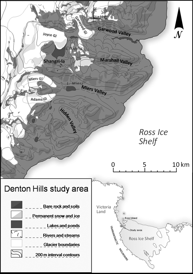 The study area of this project is three valleys in the Denton Hills area of southern Victoria Land, the Garwood, Marshall and Miers valleys, and has a total area of approximately 300 km2 (Fig. 2). These valleys are smaller than the large Dry Valleys further north, yet the diversity of these valleys is representative of the Antarctic Dry Valley environment. The elevation of the study area ranges from sea level to approximately 1300 m.