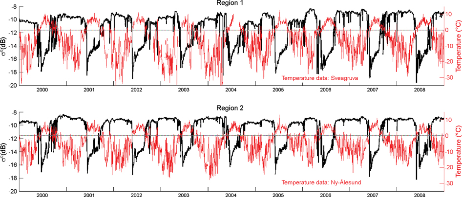 Nine-year time series (2000–08) of the average backscattering (σomean) for all ice-covered areas within Region 1 and Region 2 (for boundaries see Fig. 1) compared to corresponding temperature records from local weather stations.