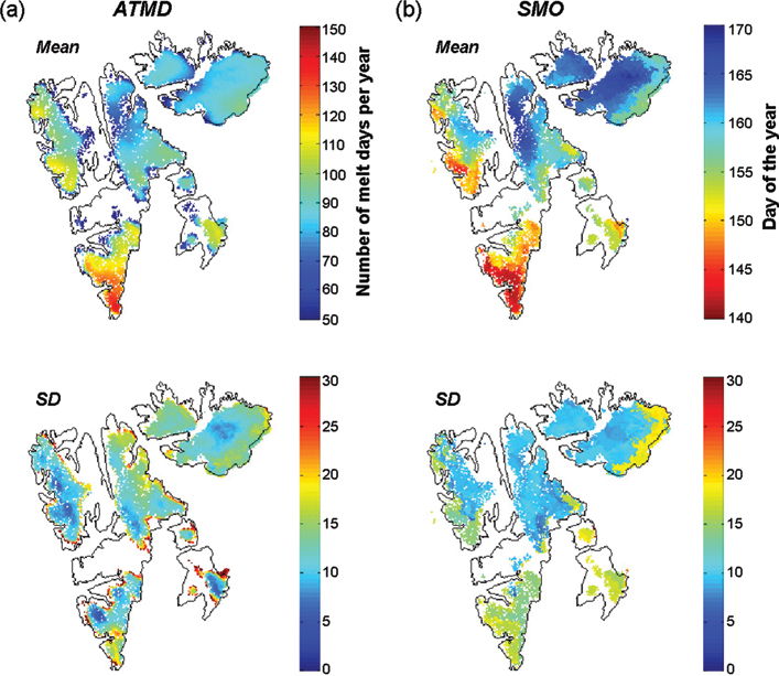 Mean and standard-deviation patterns of (a) annual total number of melt days (ATMD) and (b) summer melt onset (SMO) with respect to the 2000–08 period of observation.