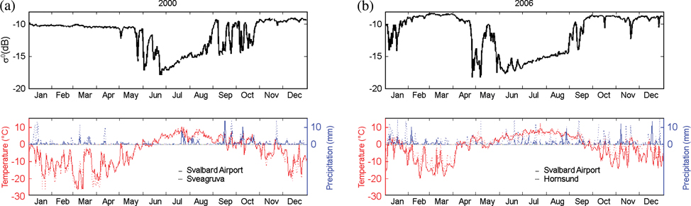 Above-freezing temperatures recorded in January and April 2006 coincided with significant precipitation events (likely rain) as humid, maritime air was brought in with low-pressure systems from the south-west. According to Winther (2003), such events are characteristic for the climate in Svalbard throughout the year. In response, the intensive QuikSCAT winter-backscatter signal experiences several sudden and strong reductions as the temperature increased rapidly and the snow surface eventually reached melting conditions. During winter 2000, when temperatures remained below 0°C without interruption, precipitation events did not have such effect. From energy-balance modelling, Boike et al. (2003) concluded that melting processes due to warm weather events occurring during the winter period are dominated by the sensible heat flux and heat supplied by rain.