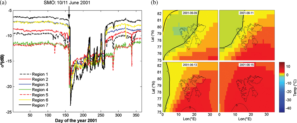 Synchronous melt onset over all of Svalbard: (a) σomean-time series for seven Svalbard regions in 2001, and (b) US National Centers for Environmental Prediction and US National Center for Atmospheric Research (NCEP/NCAR) maps of air-temperature fields from 9 to 15 June 2001.