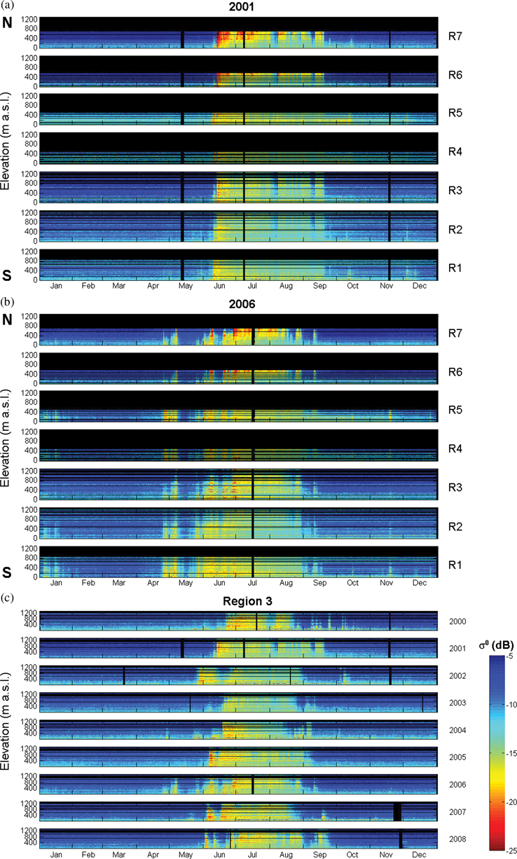 Apart from these events, altitude and latitude determine snowmelt onset to a large degree. However, we observe only a weak correlation between those parameters. In some years or some regions an expected gradual melt onset with altitude and latitude is entirely missing as illustrated in Fig. 9. Regional σomean backscatter values were computed for each elevation level and plotted over the course of a year. Warm colours represent low backscattering linked to melting snow, while cold colours correspond to high backscatter during freezing conditions. In Fig. 9a sudden backscatter reductions across all elevation levels and regions from north (top panel) to south (bottom panel) mark the archipelago-wide simultaneous SMO described above. The anomalously early SMO of April 2006 is clearly visible in Fig. 9b, followed by a colder period leading to an intermittent freeze-up in May. Subsequently, a second melt onset occurs gradually from south to north and from lower to higher elevations. Short-term melt events in January 2006 can also be identified in Fig. 9b, in particular regarding regions R1, R2 and R5. The generally high year-to-year variability in SMO and ATMD during 2000–08 is illustrated in Fig. 9c for a sample region (R3).