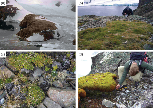 Flowering plants at the new southern limit of their global distribution. (a) Oblique aerial photograph of the un-named peninsula on north-west Alexander Island. (b) Example of a well-developed grass sward found during the survey. (c) Example of a mixed community with both species of flowering plant, including fruiting Colobanthus quitensis. (d) Polytrichum strictum peat bank of >30 cm depth.