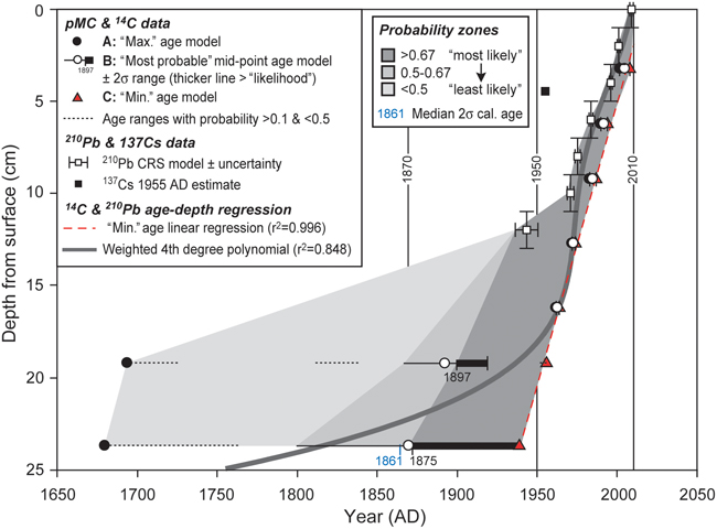 As Pb-210 and Cs-137 data are at or near detection limits and Cs-137 is less mobile in frozen soil compared to saturated organic soils, we consider the radiocarbon chronology to be more reliable overall. Radiocarbon “bomb calibrated” dating data indicate that the age of all material above 16 cm is firmly post-1960 AD. The only traditional radiocarbon age obtained suggests 24 cm depth could be as old as ca. 1800 AD, which is broadly consistent with extrapolated Pb-210 age estimate. Due to the nature of the current radiocarbon calibration curve in this time period, we cannot rule out ages as old as ca. 1800 AD or as young as ca. 1954 AD (Table 3). Since the conventional radiocarbon age at 24 cm depth is 100±40 years (Table 2) and its median calibrated C-14 age is 1861 AD (Table 3), we consider the “most likely” colonization age to be post ca. 1870 AD (Fig. 3, Table 3). Overall, growth rates from the most probable C-14 age range of 1870–2005 AD average ca. 1.5 mm y–1, consistent with, but lower than the Pb-210 based estimate, and slightly faster than the Cs-137 based growth rates.