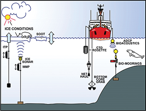 Schematic illustrating the range of ocean observing techniques deployed annually by the two icebreakers of the Canada Three Oceans project (C3O) along a 15 000 km track through Canada's Pacific, Arctic and Atlantic waters. (Figure used with permission of E. Carmack.) Abbreviated terms: conductivity–temperature–depth recorders (CTD); ice-tethered profiler (ITP); McLane moored profiler (MMP); and acoustic Doppler current profiler (ADCP). See Carmack et al. (2010)