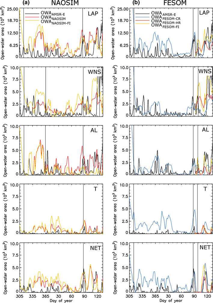 Polynya openings, here characterized by an increase of the open-water area, are visible in all data sets, e.g., the polynya events around 27 March (day 87) in the WNS polynya or in late December/early January (days 361–364) in the AL polynya. However, the duration and magnitude of the increased open-water areas are overestimated in NAOSIM and NAOSIM-FI. In the WNS, a polynya opening occurs in the AMSR-E data at the end of December and lasts for a few days. This event is also visible in the NAOSIM and NAOSIM-FI open-water areas but there it lasts for approximately 13 days. The striking event in the WNS in late April/early May (days 118–126) is underrepresented in NAOSIM open-water area. The NAOSIM-FI open-water area reproduces this event better but a bit earlier in time compared with AMSR-E data.