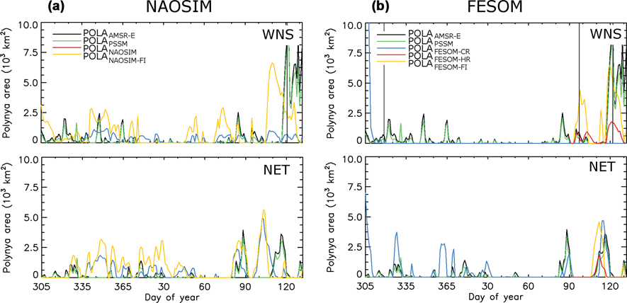 Polynya activity from FESOM-CR and FESOM-HR shows features similar to those of the NAOSIM time series: the duration of the polynya openings is also overestimated and the striking opening at 29 April (day 120) in the WNS is not well shown. In contrast to this, FESOM-FI open-water area represents this event clearly.