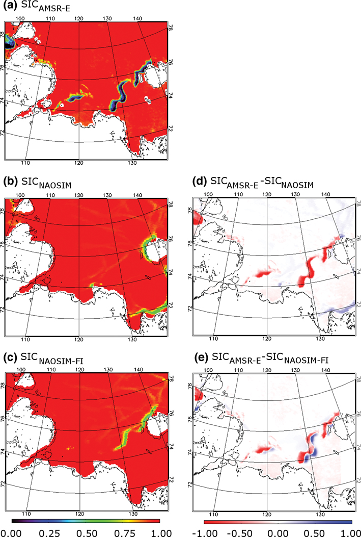Maps of sea-ice concentration (SIC) on 29 April 2008 derived from (a) Advanced Microwave Scanning Radiometer–Earth Observing System (AMSR-E) data, (b) the North Atlantic–Arctic Ocean–Sea-Ice Model (NAOSIM) and (c) another version of this model, NAOSIM-FI. In (a) and (b) yellow–green features denote the polynyas, light orange features indicate leads. Plots showing the difference that results when (d) NAOSIM and (e) NAOSIM-FI simulations are subtracted from the AMSR-E sea-ice concentration.