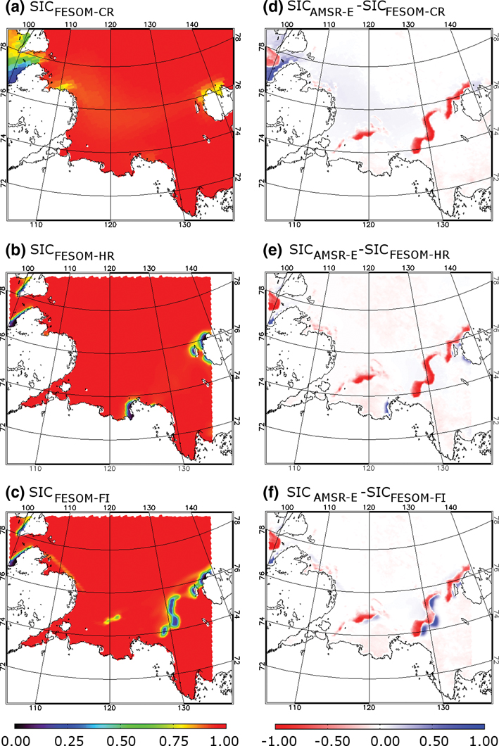 We also use three sea-ice concentration data sets obtained from FESOM. One comes from the model configuration with coarse spatial resolution (FESOM-CR) described by Rollenhagen et al. (2009), the second ice concentration data set is derived from the newly configured fine-scale FESOM model version on a regional grid (FESOM-HR) and the third ice concentration data set is derived from the fine-scale FESOM model version that includes additionally a landfast-ice parameterization. We refer to this model as FESOM-FI.