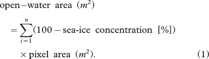 We calculate the open-water area as follows: for each pixel in the region of interest the fraction of open water is determined, multiplied by the pixel area (6.25×6.25 km2) and summarized for the entire subset:
