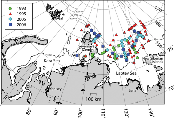 Geographical distribution of stations with δ18O data from summer expeditions in 1993, 1995, 2005 and 2006. Also indicated are the Ob and Yenisey rivers in the Kara Sea and the Lena River in the Laptev Sea (an arrowhead marks the major discharge in the Lena Delta).