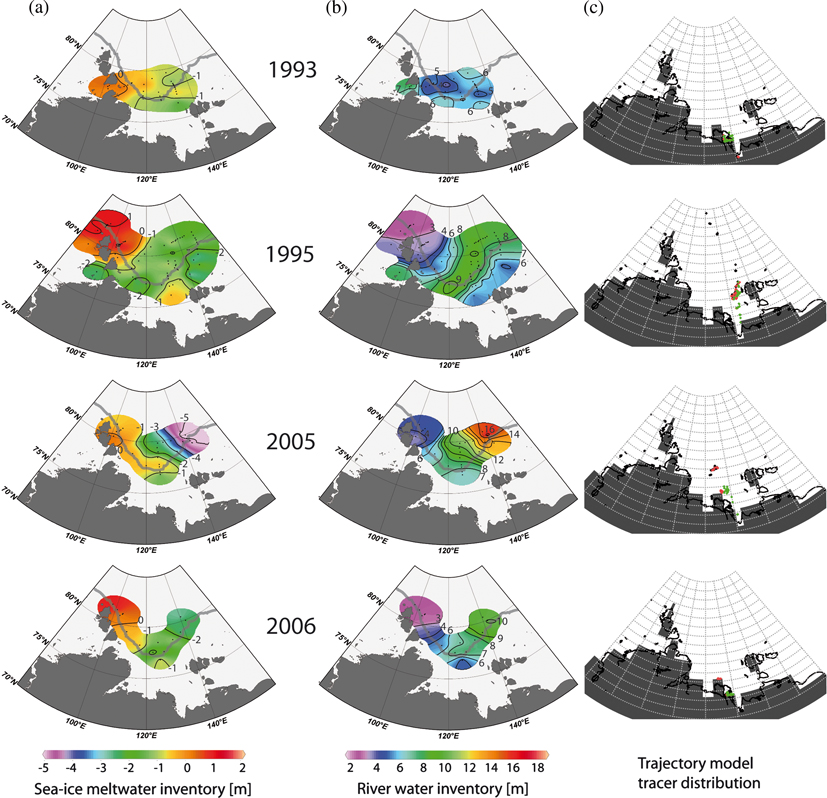 To the north-west of the Laptev Sea, river water inventory values are consistently between 3 and 5 m, and increase towards the east, where absolute values are quite variable (Fig. 3). In 1993 and 2006, values of river water inventories above 8 m are absent, or are only found east of about 138°E, whereas in 1995 and 2005, river water values above 8 m are also found further to the west, at 125°E and 134°E, respectively. This suggests that the transport of river water in 1995 and 2005 may also occur directly to the north, whereas in 1993 and 2006 the river water left the Laptev Sea further to the east, or was possibly a remnant from preceding years only. In 1995 relatively high river water inventory values were observed over a rather large area, whereas in 2005 extremely high values, up to 18 m in the river water inventory, were found in a comparably small area. Sea-ice meltwater inventory values are positive north-west of the Laptev Sea, and are increasingly negative towards the east.