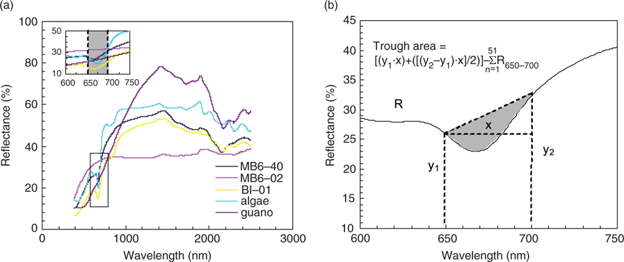 After the death of algae growing in lakes or ponds, pigments from the algae will be deposited and preserved for a long time in the sediments, leaving a record of the original aquatic plants. Therefore, the sedimentary pigment concentrations such as chlorophyll a at different depths can be used to reconstruct historical changes in lake primary productivity (Leavitt & Hodgson 2001; Michelutti et al. 2005; Wolfe et al. 2006). Because determining pigment concentrations is generally time-consuming and costly, some studies have attempted to use reflectance spectroscopy as a rapid technique to assess the content of chlorophyll a in sediments (Das et al. 2005; Wolfe et al. 2006; Das 2007; Michelutti, Blais, Cumming et al. 2010). The results showed that the relative level of sedimentary chlorophyll a in sediments can be measured through calculating the dimensionless trough area between 650 and 700 nm. Using the method of Wolfe et al. (2006), we calculated the dimensionless trough area between 650 and 700 nm in all the spectral curves of the East Antarctic pond sediments that we collected. The schematic diagram of the trough area calculation (Fig. 2b) illustrates the trough area between 650 and 700 nm.