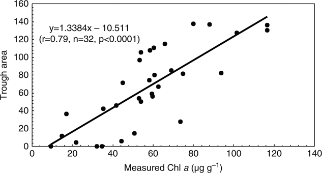 Modelling relationship between the trough area at 650–700 nm and the measured chlorophyll a concentrations for the 32 samples from the three sediment profiles.