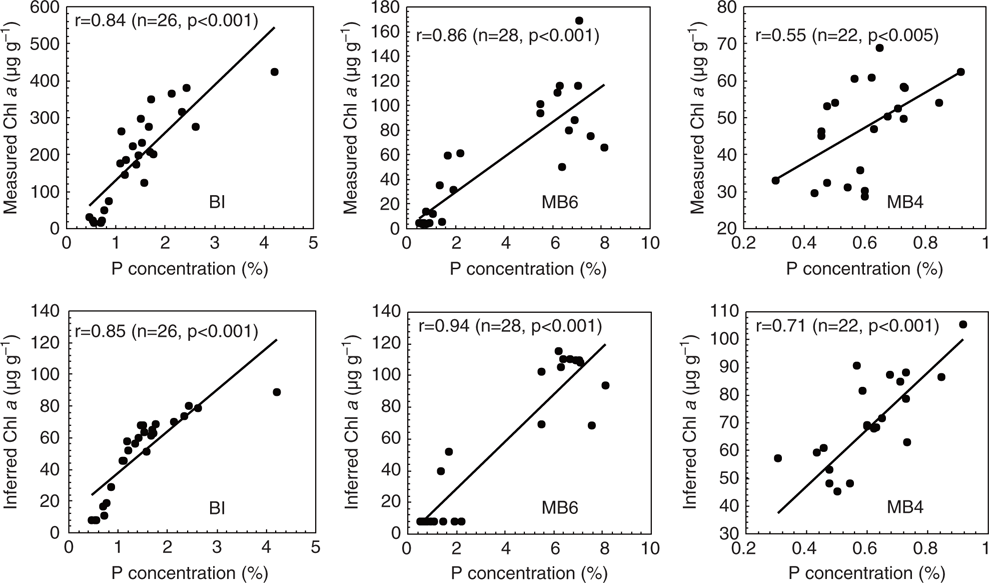 Correlations of P with measured and inferred chlorophyll a concentrations in the ornithogenic sediments of BI, MB6 and MB4.