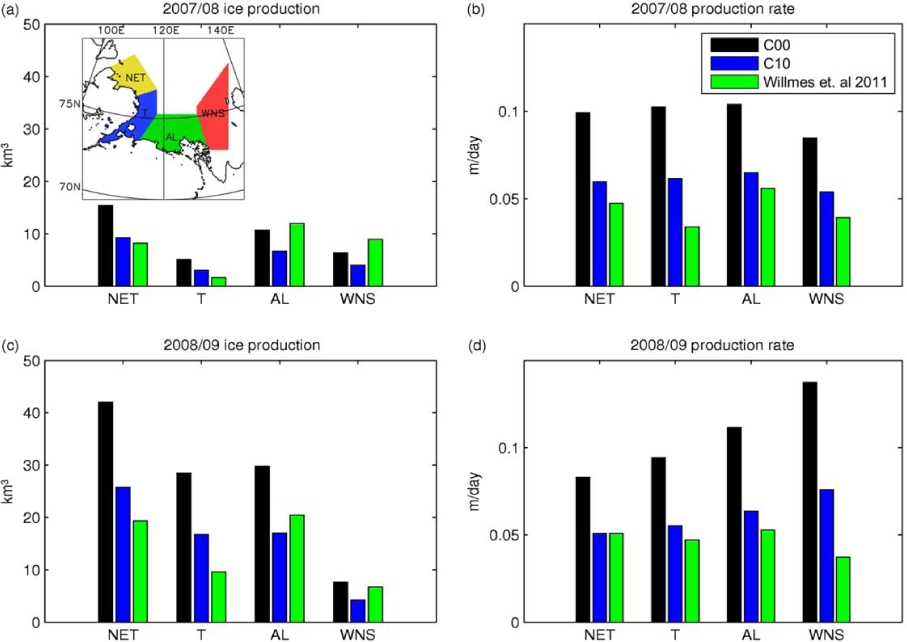 A comparison between our results and previous studies yields a good agreement with the satellite-based method of Willmes et al. (2011) for C10 in terms of annual ice production: 30 km3 (C10) compared to 34 km3 (Willmes et al.) in 2007/08, and 73 km3 (C10) compared to 59 km3 (Willmes et al.) in 2008/09. Regional distributions are similar during winter 2007/08, but differ for winter 2008/09, showing higher ice production for C10 in the western Laptev Sea polynyas compared to that estimated by Willmes et al. (2011). In comparison with the mean distribution for the complete 28-year time series of Willmes et al. (2011), the ice production is unusually high in the NET and T sub-region in winter 2008/09.