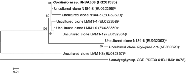 Cyanobacterial mat samples were collected from a shallow ephemeral freshwater near King Sejong Station (62° 13′S−58° 47′W) located on Barton Peninsula, King George Island, West Antarctica, in January 2010. Aliquots (1 ml) of mat samples were inoculated into 100 ml BG-11 medium (Rippka et al. 1979) containing 250 µg cycloheximide ml−1 (Sigma, St. Louis, MO, USA) and incubated at 15°C with cool fluorescent light (approximately 70 µmole m−2 sec−1) in a light:dark cycle (16:8 h) until growth was apparent. Well-grown cyanobacterial cultures (1.5 ml) were centrifuged and streaked onto BG-11 agar. Emerging cyanobacterial filaments were then aseptically transferred to fresh BG-11 plates to separate cyanobacteria from contaminating bacteria. Cyanobacterial filaments were then streaked onto R2A and LB agar plates (Becton, Dickinson and Co., Sparks, MD, USA) and incubated for 14 days in the dark to check the axenic status of the culture. These steps were repeated until a pure culture of the cyanobacterium was obtained and the resulting pure culture was named as KNUA009 and the isolate was deposited at the Korean Collection for Type Cultures under the accession number KCTC AG40019.