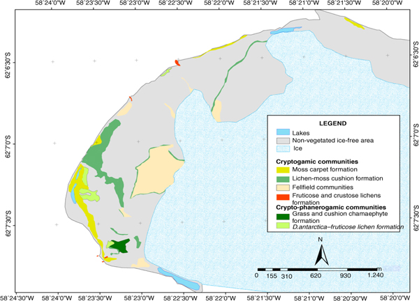 High-resolution vegetation mapping is critical for a better understanding of the impacts of environmental factors that control vegetation development, allowing for the future monitoring of these communities. The extremely dynamic aspect of geomorphic surfaces and related soils under periglacial and paraglacial conditions results in a high variation in plant communities within the scale of a metre. Differences in species composition can be found within a small area (Victoria et al. 2009) due the heterogeneity in terrain, microtopography, substrate type and soil chemistry in small ice-free areas. This makes map scale a very important factor to be considered when producing a cartographic base for future monitoring studies.