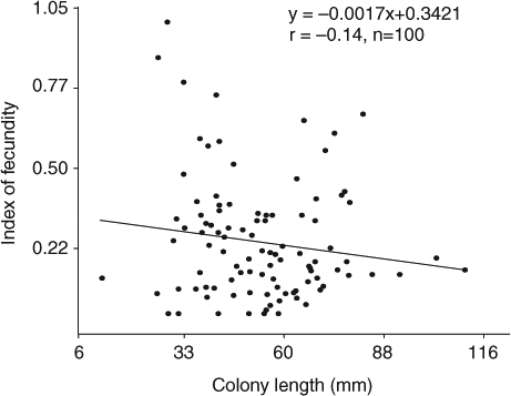 The fecundity of M. daytoni was estimated using the fecundity index adapted from Soong (2005). This index is calculated as the number of mature oocytes·mm−2 in each colony.