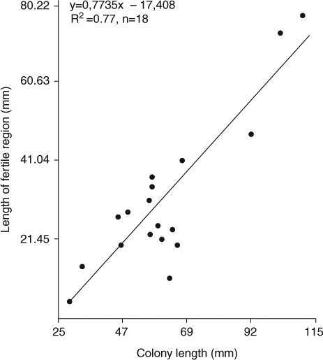 Relationship between length of fertile region (rachis) with increasing colony length in Malacobelemnon daytoni.